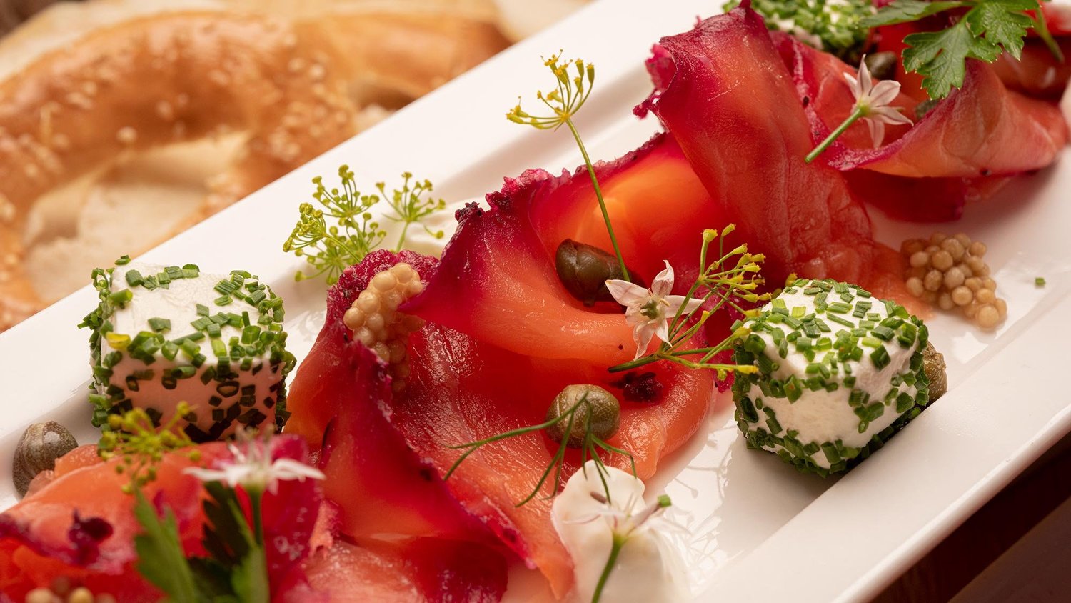 铺上一半的擦丝甜菜根、洋葱、柠檬皮和莳萝