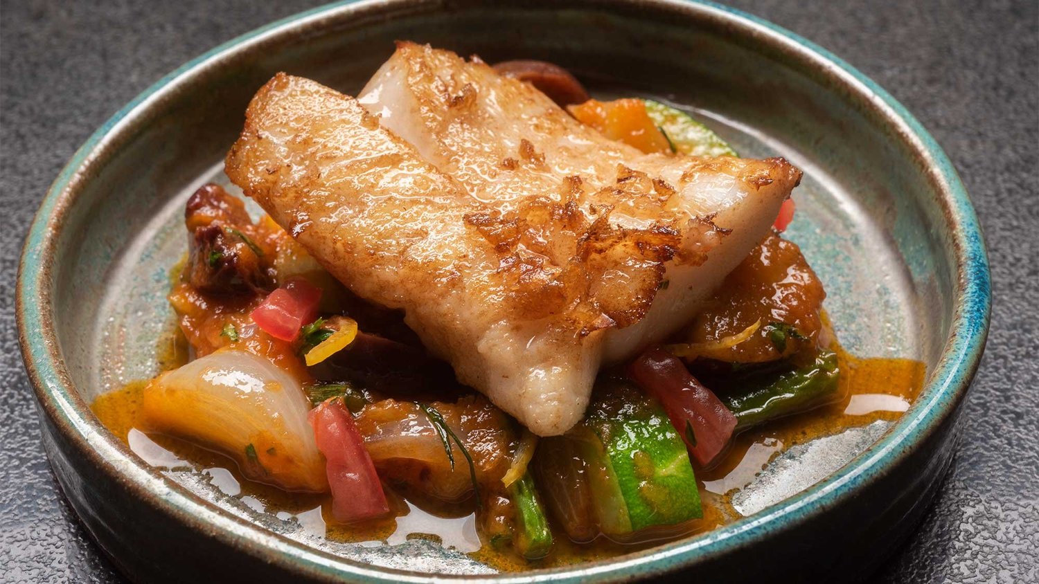 当鱼煎至金黄色时,从锅中取出,放在煮好的蔬菜上即可享用。