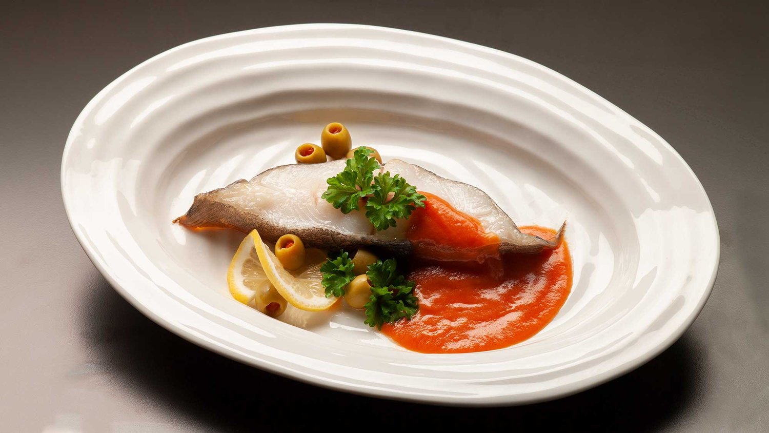 当鱼煮熟后,放到一个预热好的餐盘里。将酱汁浇在鱼上,并用橄榄、欧芹和柠檬片装饰。立即上桌。